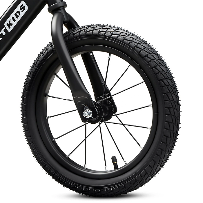 Беговел оснащен двумя надувными колесами диаметром 14 дюймов, что обеспечивает комфортное и плавное движение. Высокоуглеродистая сталь рамы гарантирует прочность и долговечность конструкции.